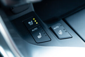 - Heated wood- and leather-trimmed steering wheel.